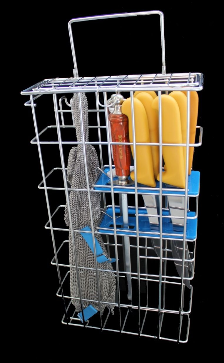 Der Messerkorb ist abschließbar und mit Bügel zum anhängen (z. B. Arbeitstisch) ausgestattet.
